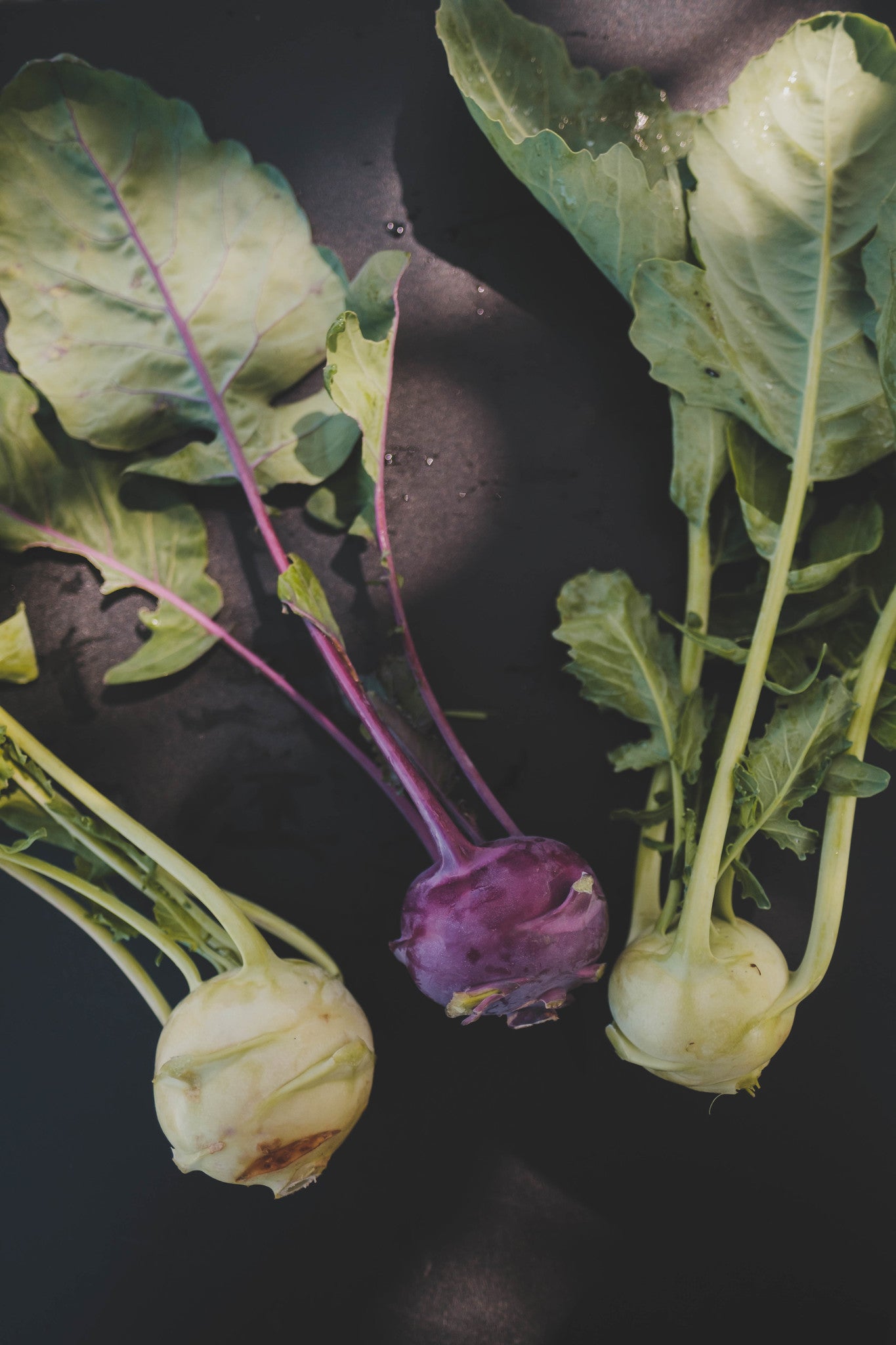 KohlrabiKohlrabi ist ein Gemüse aus der Familie der Kreuzblütler, das eine verdickte, kugelförmige oder runde Knolle bildet, die oberirdisch wächst. Es gibt sowohl grüne als auch violette Sorten von Kohlrabi. Die Knolle hat eine leicht süße, nussige Geschmacksnote und eine knackige Textur, ähnlich wie Radieschen oder Brokkoli. In der veganen Küche kann Kohlrabi auf verschiedene Weise zubereitet werden. Hier sind einige Ideen: - Kohlrabi- Pommes: Schneide den Kohlrabi in dünne Stifte, lege sie auf ein Backblech, beträufle sie mit Olivenöl und würze sie mit Salz, Pfeffer und anderen Gewürzen nach Geschmack. Backe sie im Ofen, bis sie goldbraun und knusprig sind. Serviere sie als gesunde Alternative zu Kartoffelpommes.